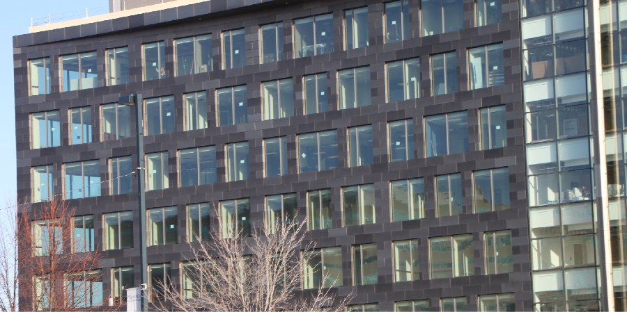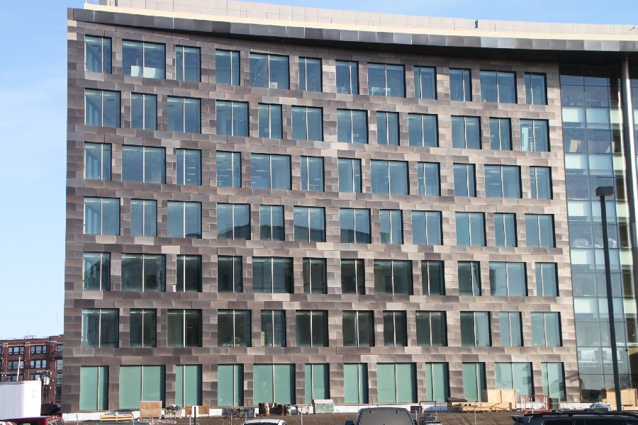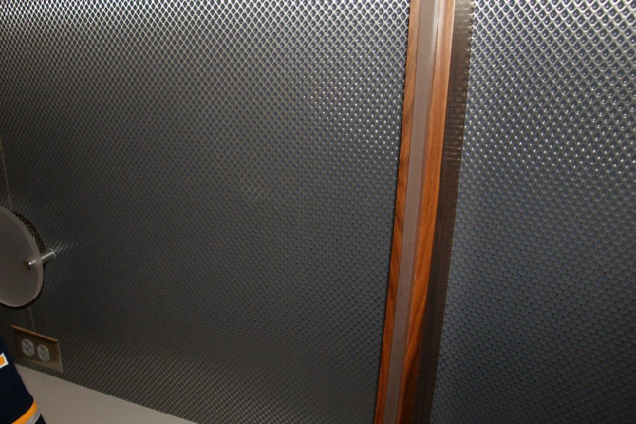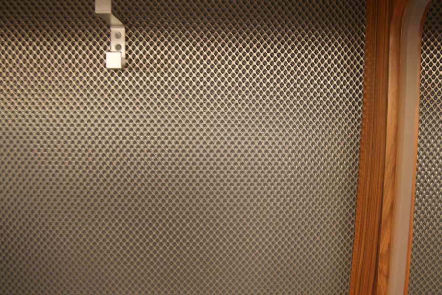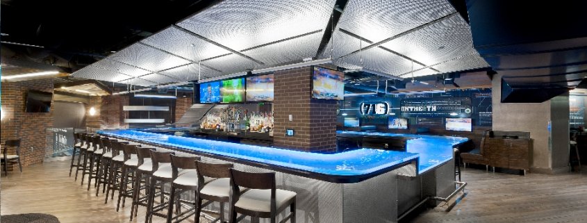 Rigidized® Metals Corporation provided the fully fabricated acoustical ceiling panels over Bars B and C, the hostess station and the stairwell. These panels are composed of 304 stainless steel in 2B finish, 20 gauge, perforated and rolled with Rigidized® Metals’ pattern 1RL, with a 1″ square aluminum frame. Additionally, Rigidized® Metals Corporation provided 304 stainless steel, 20 gauge Sandtex® rolled with Rigidized® Metals’ pattern 5HR for all three bar fronts and the back of the bottle shelf behind the main bar. Lastly, Rigidized® Metals provided the 316 stainless steel, bronze colored, rolled in Rigidized® Metals’ pattern 6SL®, for the front exterior entrance way panels.