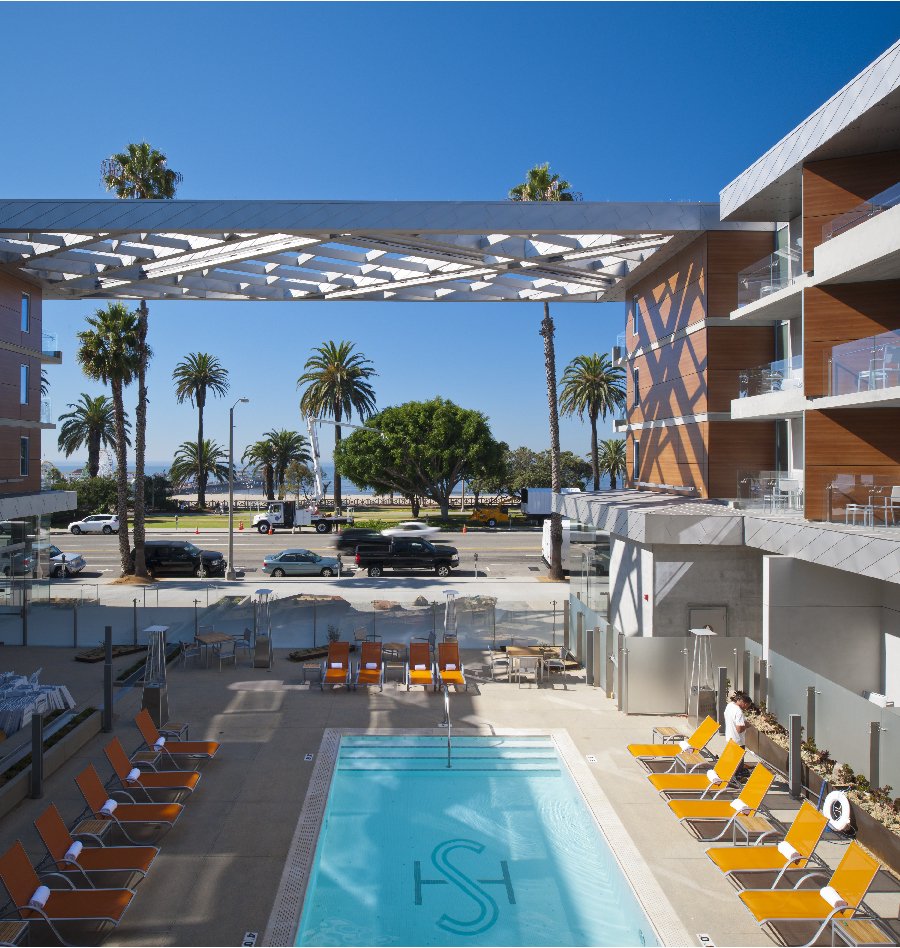 The vision of Shore Hotel blends the local natural landscape and vibrant urban life while taking in the beauty of the sea and embracing the pedestrian activities of the area. Just blocks from the Santa Monica Pier, located on the ocean front and with a strong retail presence at the back of the hotel, the Shore Hotel boasts an urban parlor and garden with a large trellis and distinct water feature that enhances what Santa Monica offers. The proximity of the ocean creates a natural foil for the new hotel.