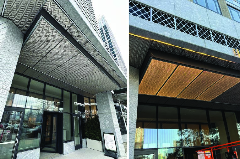 Rigidized® Metals’ pattern ACC4i deep textured metal, perforated, makes up the canopy marking the main entrance to the building. The material allowed both lighting and reinforcement of the entryway’s location at the base of the building. The perforated textured metal acts like a cloud at the entryway turning a robust canopy into a delicate structure. It has the effect of creating an outdoor room; a place to stand and commune with neighbors.