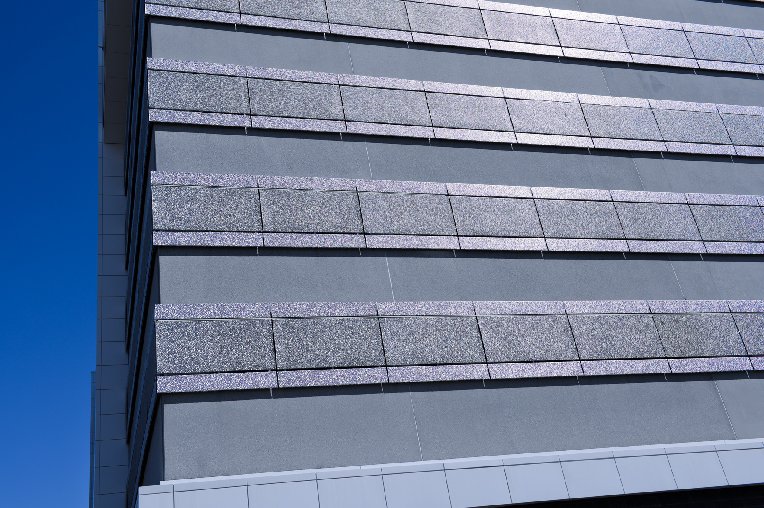 Rigidized® Metals’ 1UN pattern, perforated, clads the exterior of a parking ramp as security screens at 500 Pearl Street in Buffalo, NY. The deep texture provides strength, durability and reduces glare, while also providing an aesthetic appeal to the ramp itself.