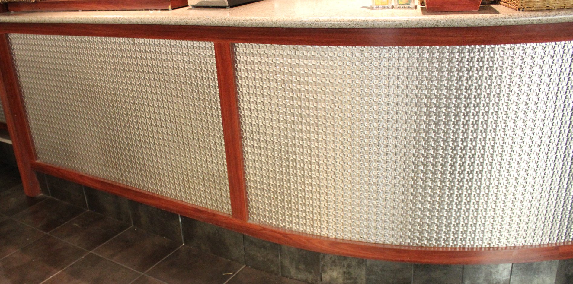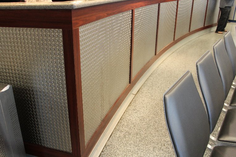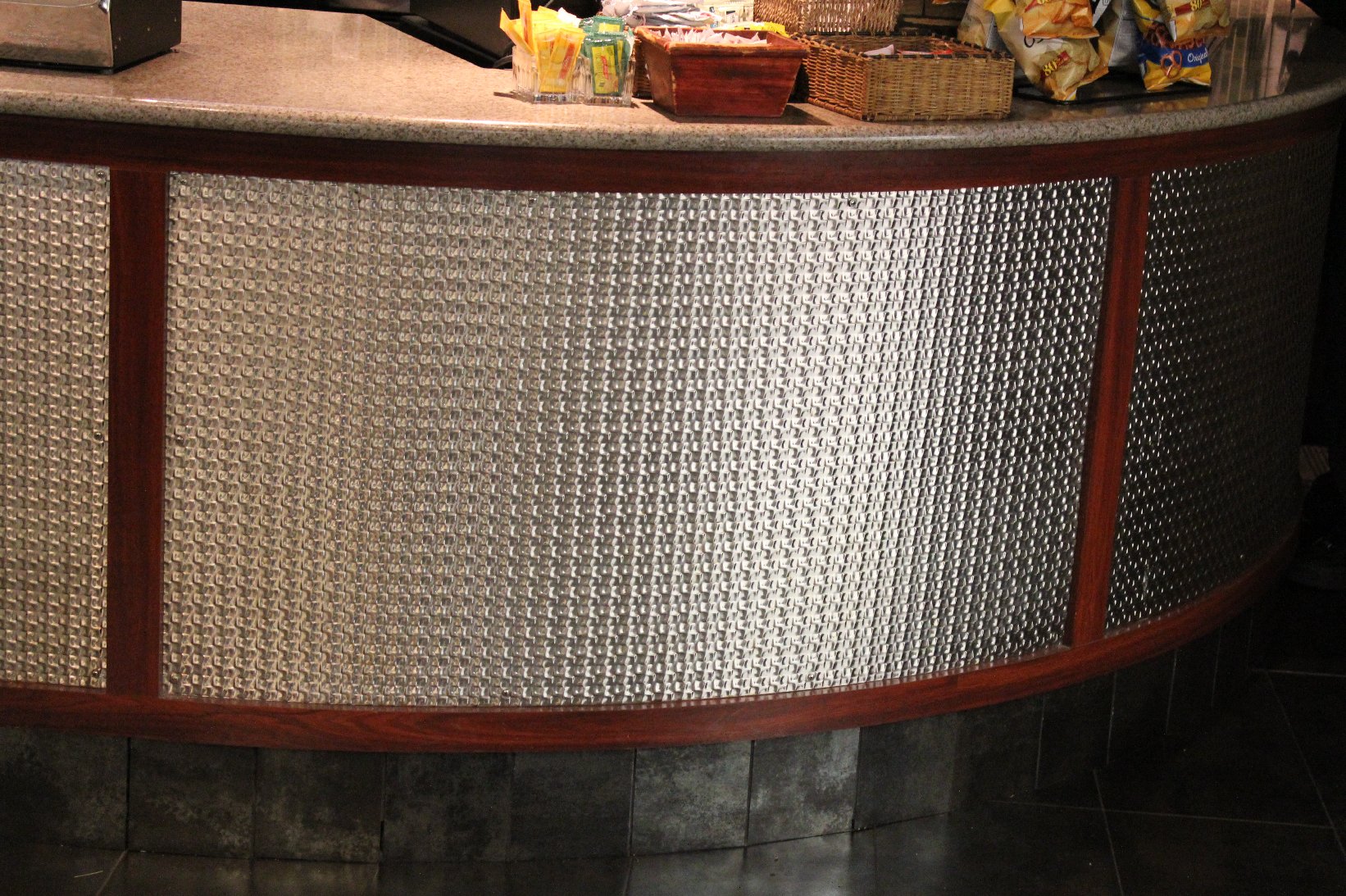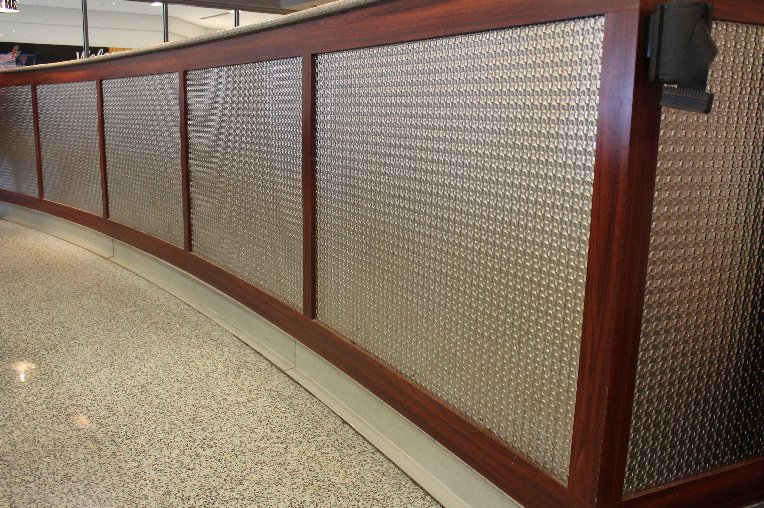 Rigidized® Metals’ pattern 1RL clads the bar and counter fronts and partitions at the Lake Erie Grille in the Buffalo Niagara International Airport in Buffalo, NY.