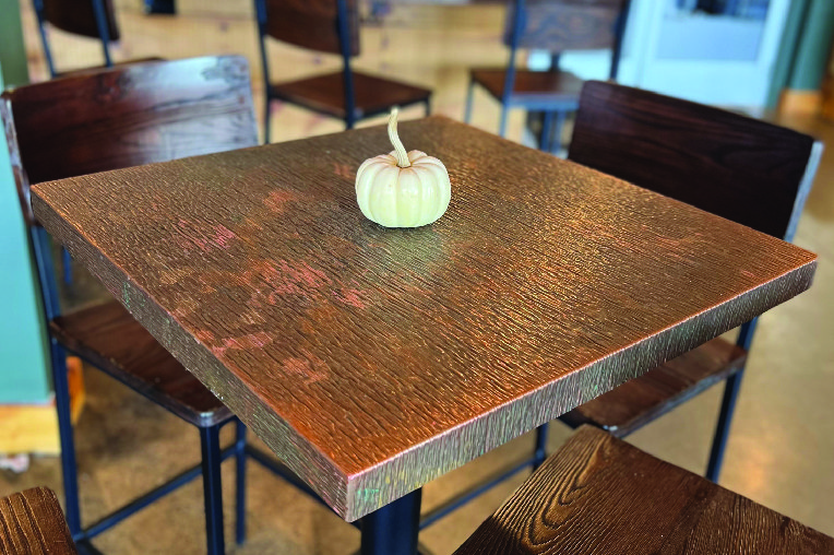 Rigidized® Metals’ pattern 1CS in copper brings the rustic look and feel that encapsulates Clarksburg Cider in Lancaster, NY. The material clads the back splash behind the taps, the bar top, and the table tops within the restaurant. The copper will naturally patina, enhancing the natural look of the establishment. The texture of the pattern provides durability and very minimal maintenance and, overall, the textured material compliments the atmosphere and aesthetic of the business.