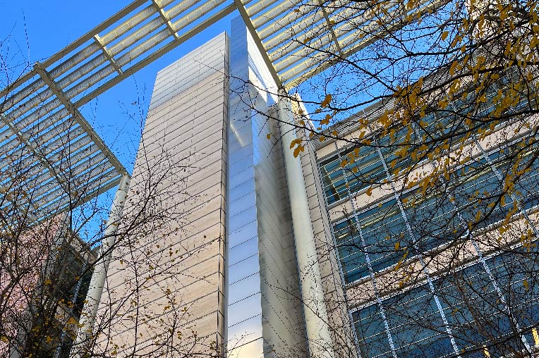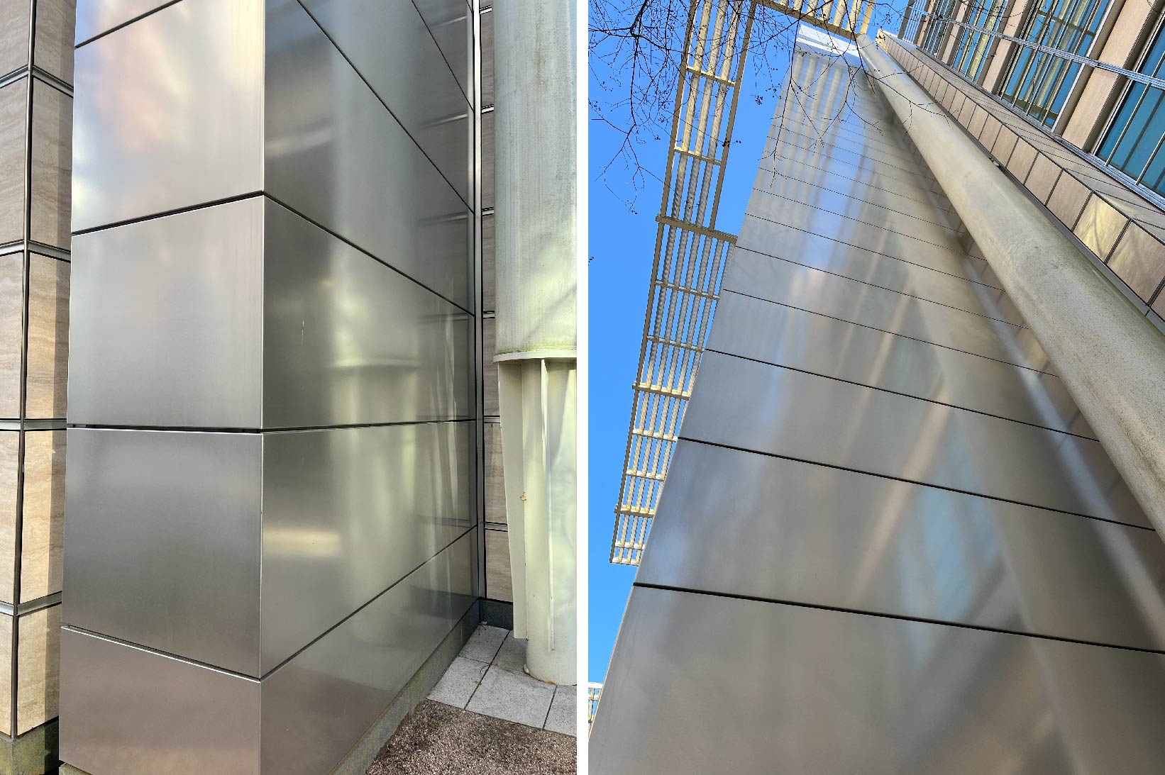 Rigidized® Metals’ InvariLux® micro texture clads the exteriors of 26 buildings at ExxonMobil’s Houston, TX campus. The micro texture is naturally cleaning, meaning dirt and grime doesn’t build up on the surface of the material and can wash off with rain water. Additionally, the uniformity of the micro texture reduces glare in a notoriously sunny area. Not only that, when it DOES rain, the stainless steel material doesn’t rust. All of these features combine to make maintenance minimal, and the durability of the product means it will last the entire lifetime of the building.