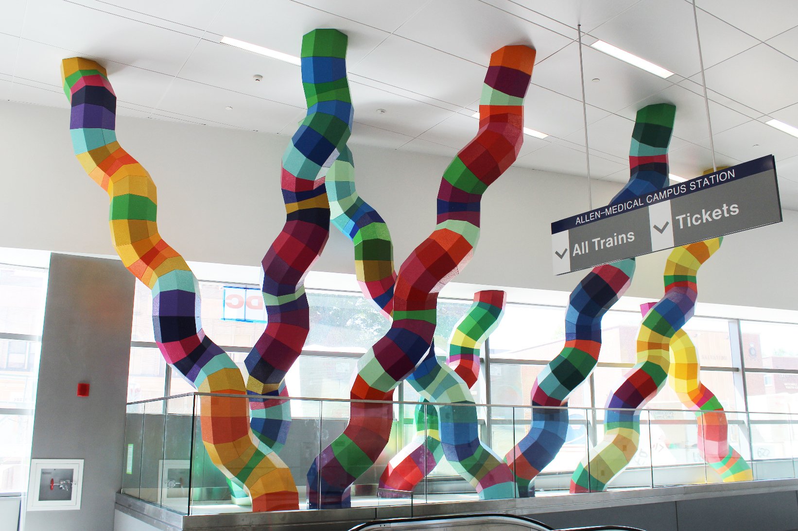 Rigidized® Metals Corporation worked with local artist, Shasti O’Leary-Soudant, to create a sculpture of seven unique technicolor tentacles, textured in pattern 1HM, and powder coated in 25 different colors. Resembling DNA strands, this 242-piece structure is fittingly located in the Allen-Medical Campus subway station that serves the Buffalo Niagara Medical Campus in Buffalo, NY.