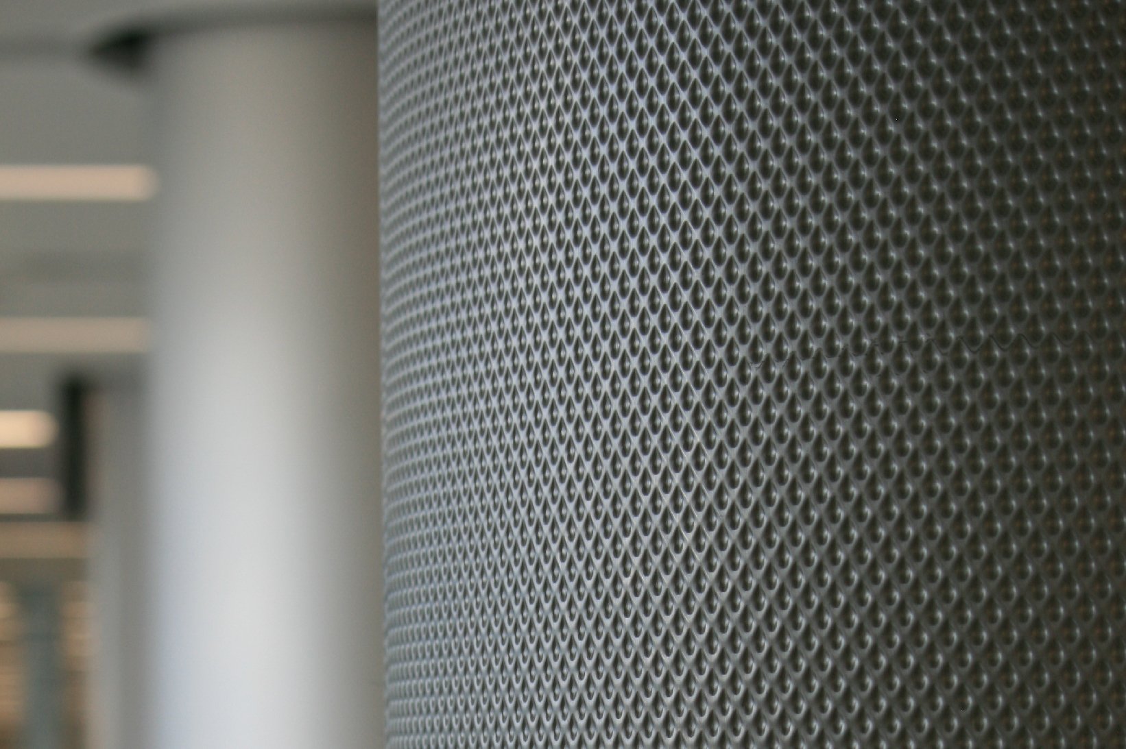 Rigidized® Metals’ 304SS #4 6WL® pattern, non-prime, and our Middlesex pattern in white, clad the column covers at the Los Angeles International Airport. The texture provides durability and hides scratches, dents and dings in this extremely high-traffic area.