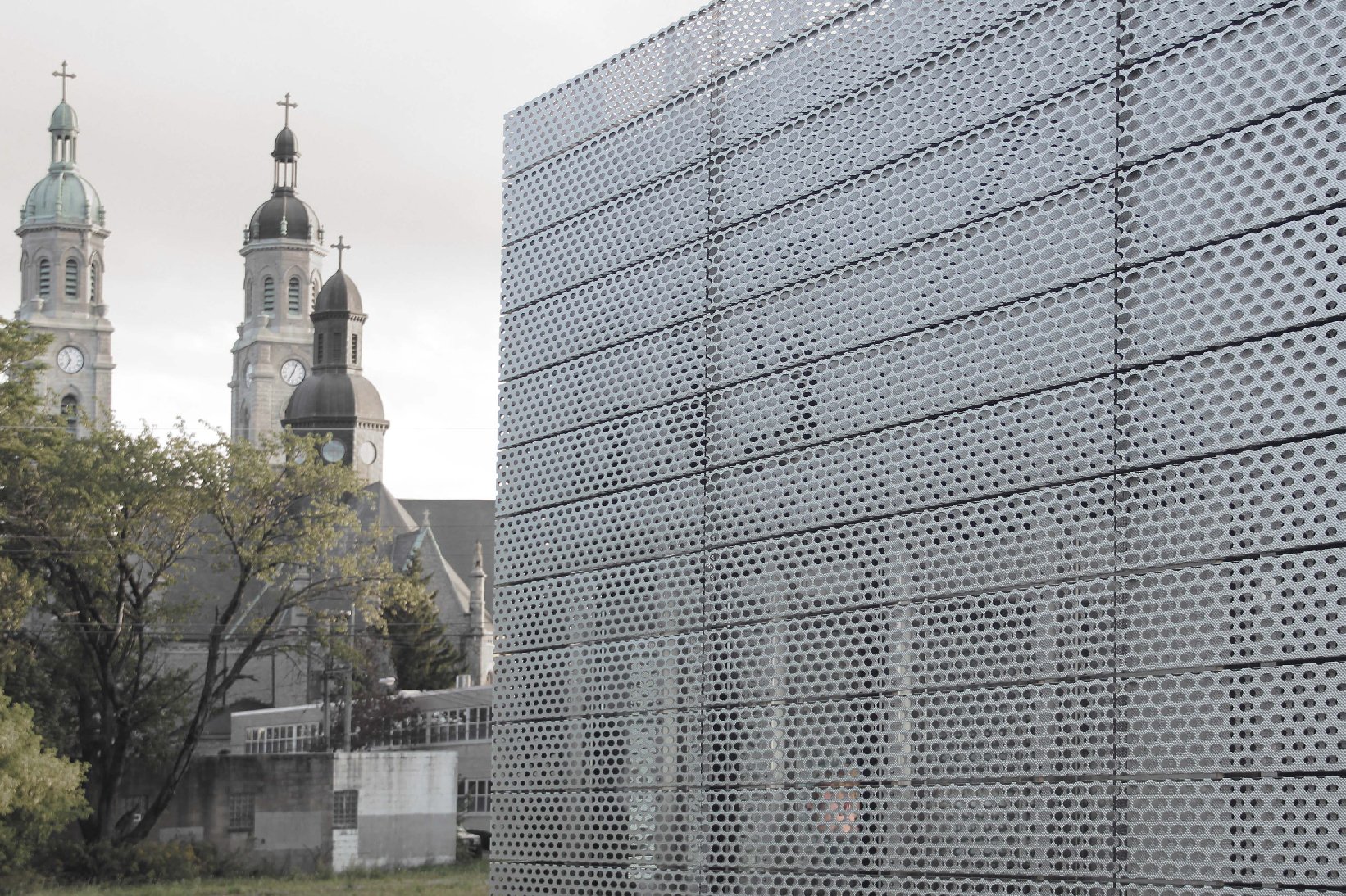 We custom designed and fabricated a metal facade to transform the Light/Station public creative space, veiling the building in perforated steel panels.