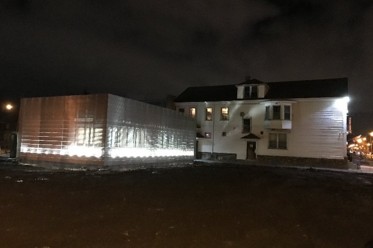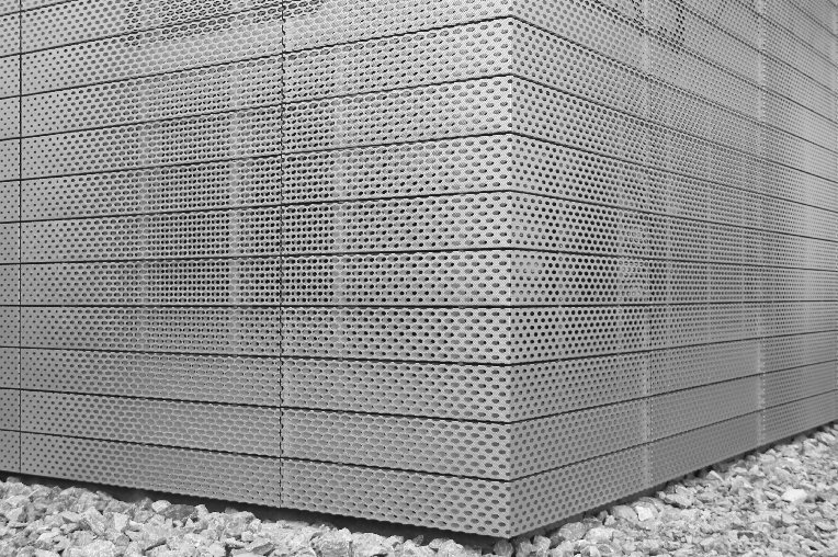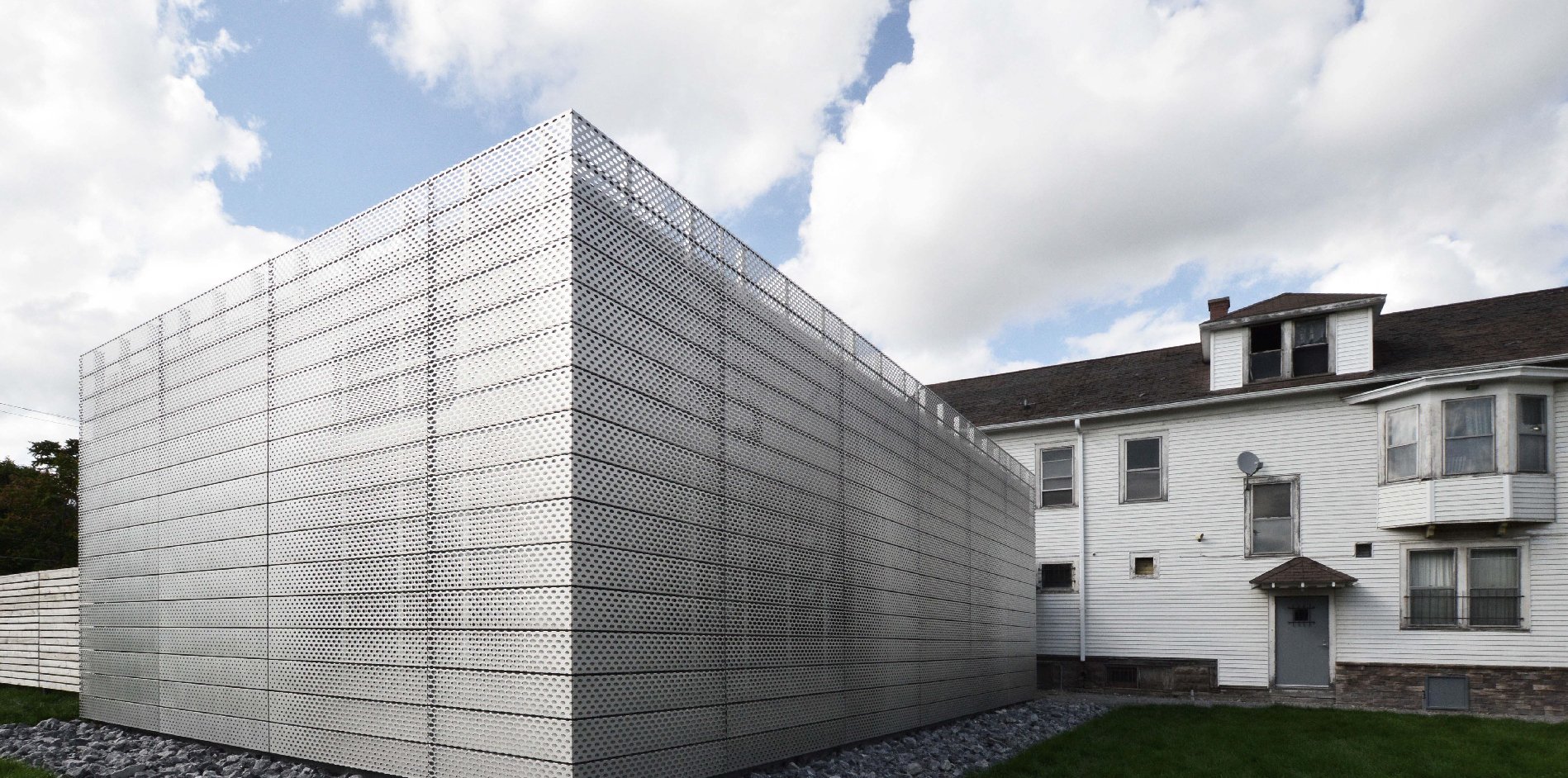 Rigidized® Metals custom designed and fabricated the facade of Light/Station with Torn Space Theater and Studio NORTH Architecture. Located at 608 Fillmore Ave in Buffalo, NY, this project transformed an abandoned gas mart into a 1,545 square foot design studio, green room and conference facility. The exterior has been transformed into a signature architectural structure, veiled in steel panels in custom perforated pattern 6WL®.