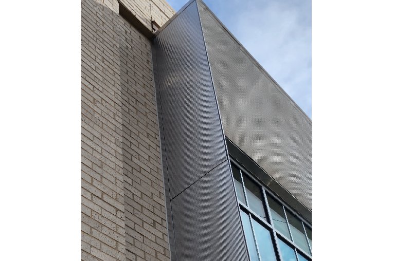 Rigidized® Metals’ deep textured pattern 5HR frames the exterior of the front doorway at the Pottawatomie County Administration Building in Oklahoma. The linear texture provides consistency and a uniform aesthetic. Additionally, the deep texture offers durability and hides the impacts of high traffic abuse. Not only that, the textured is rolled into stainless steel, providing a rust-proof, low maintenance solution for the exterior of this building.