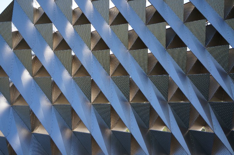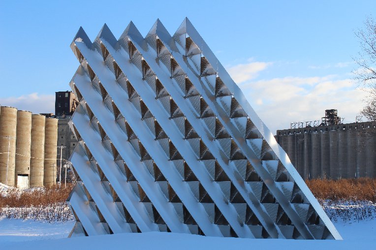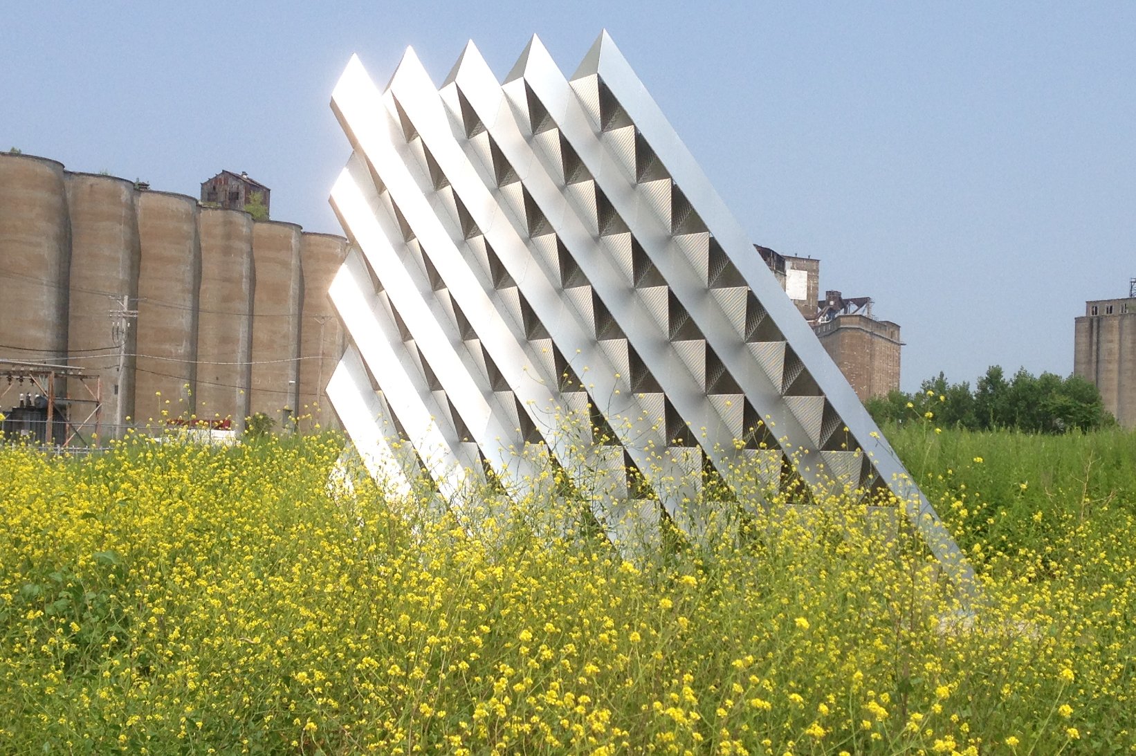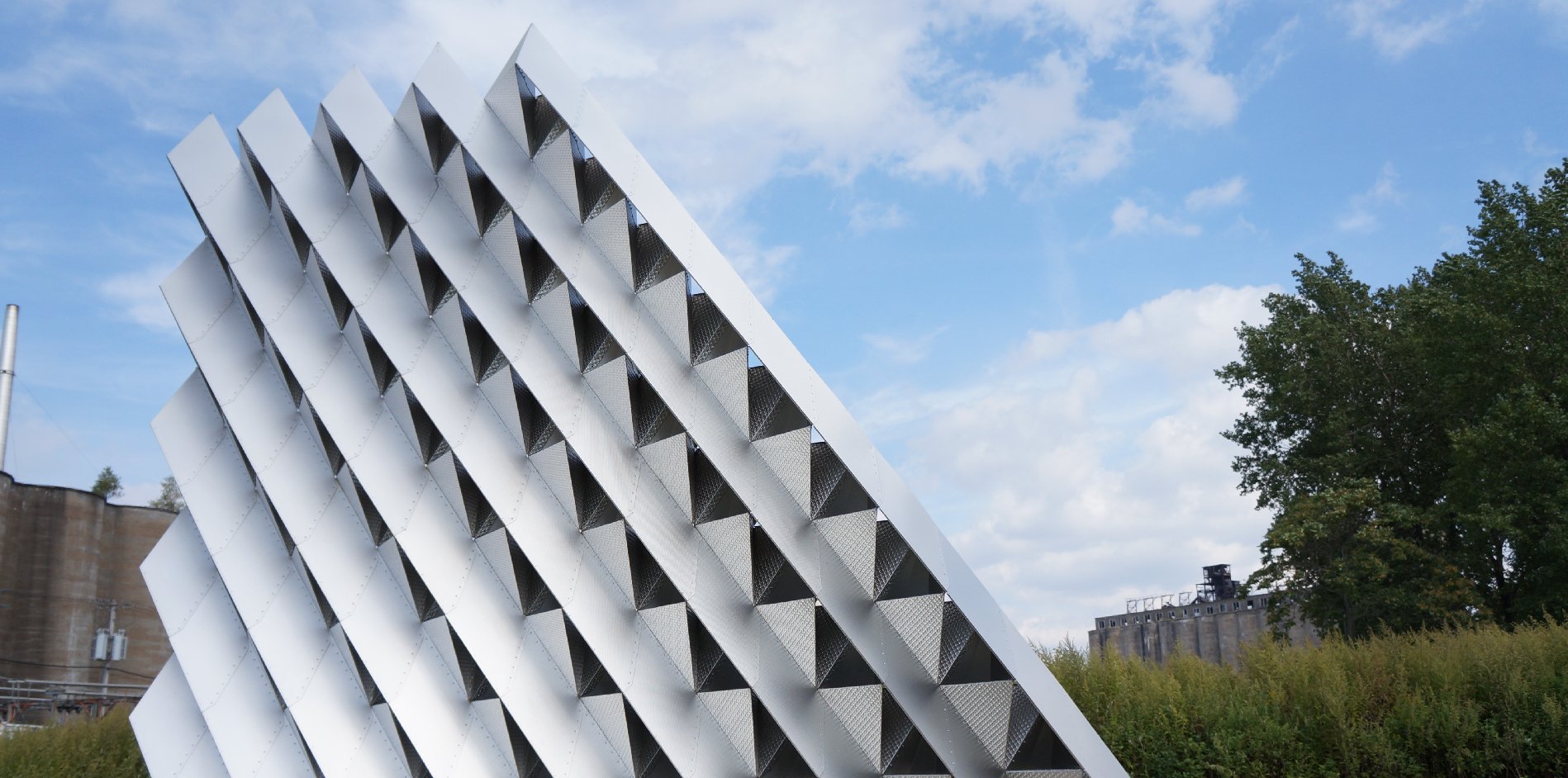 Rigidized® Metals’ collaborated with University at Buffalo’s Department of Architecture professors Christopher Romano and Nicholas Bruscia to fabricate a self-structuring and lightweight architectural screen built entirely from thin-gauge (16, 18 and 20 gauge) sheet metal. Located outside of Rigidized® Metals’ facility in Buffalo, NY, this weather-resistant structure has been able to withstand the harsh Buffalo winters, as well as over 60mph wind gusts at times.