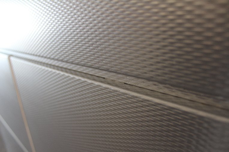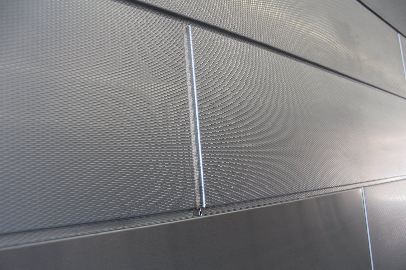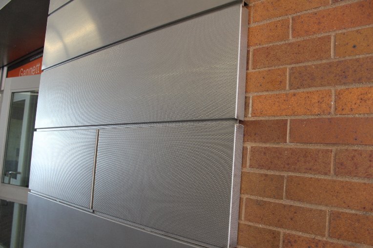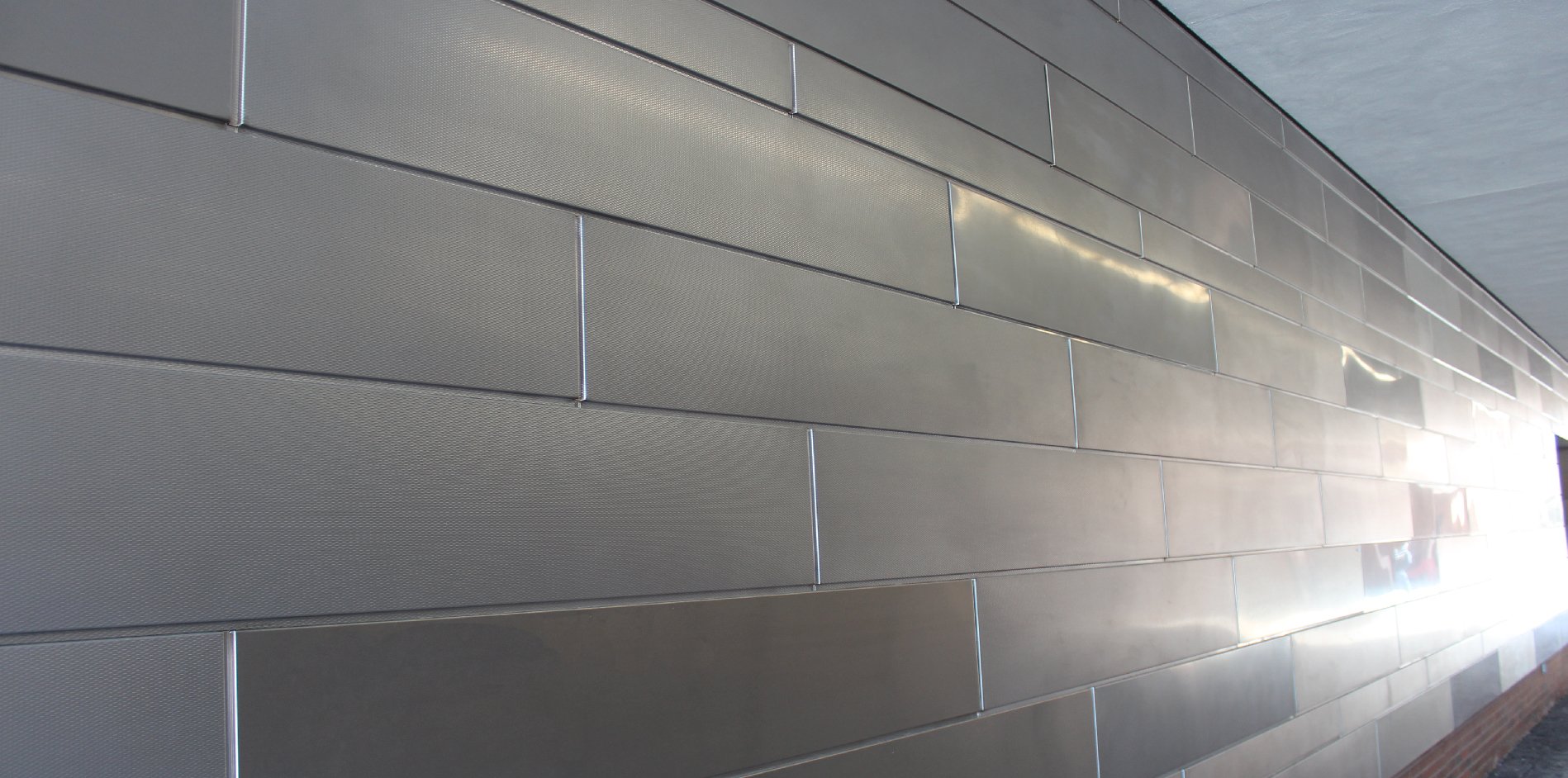 Three of our textured metals are installed in combination as a cohesive wall panel system, lining a covered walkway on the RIT Campus in New York State.