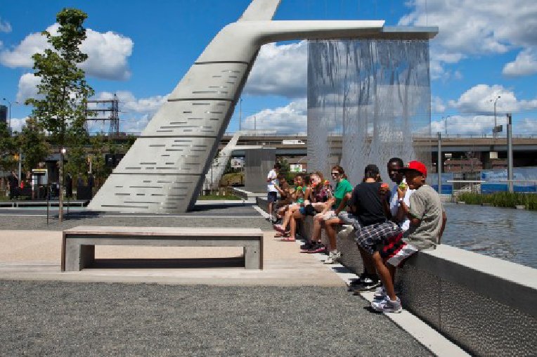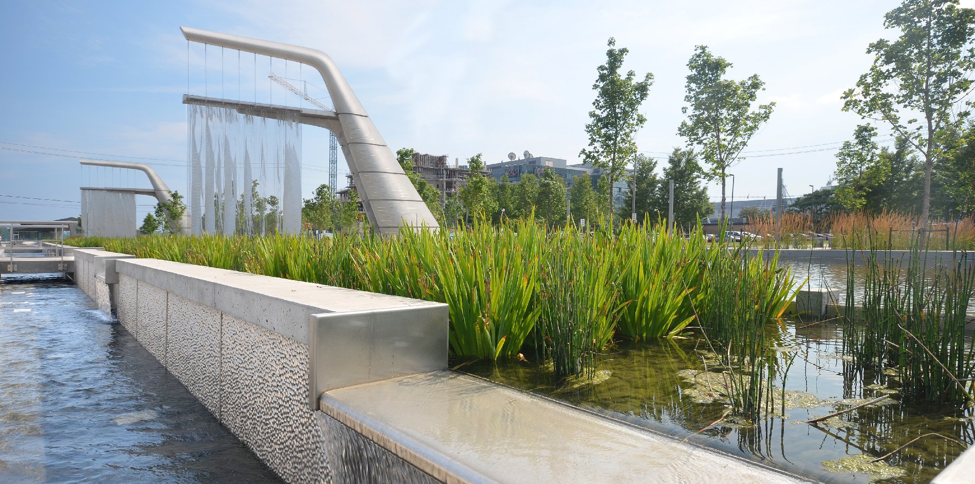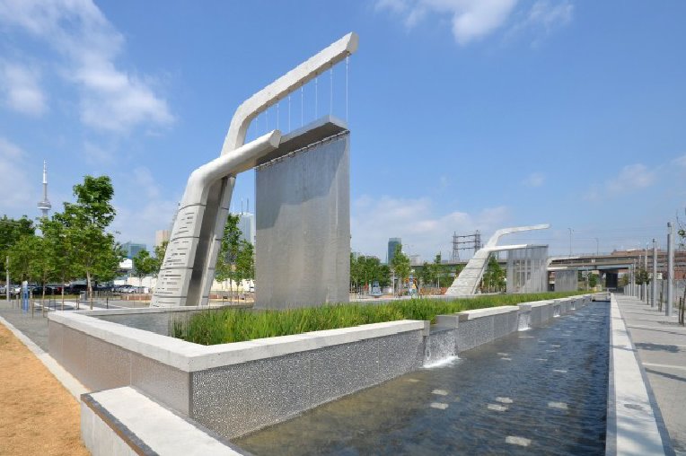 Our 1UN deep textured metal panels can also be used for aquatic purposes, as in the pebbled texture lining of this public water feature on the Canadian waterfront.