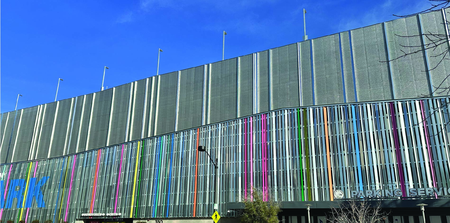 The Rigidized® Metals panels work together well with the colorful metal façade of the existing portion of the parking structure while visually cleaning up the expansion and hiding the concrete of the parking garage structure.