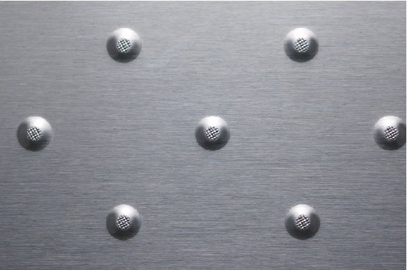 Rigidized® Metals’ Rigi-Bump® is a collection of flat and dome top circular and square impressions pressed into a wide variety of sheet metals. Standard sheet dimensions are 48″ x 96″ and are available in stainless steel, aluminum, bronze, copper, brass, and mild steel. Custom bump patterns are available upon request. Rigi-Bump® patterns RB5 and RB6 are available with knurled bumps, providing an additional element of texture.