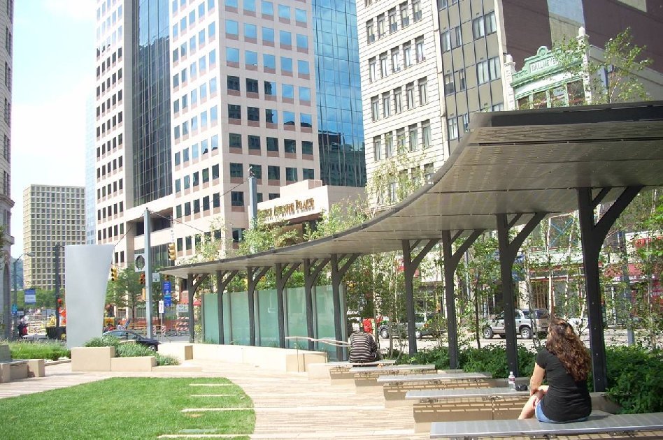 Pittsburgh, PA – Triangle Park is a calm oasis among the hustle and bustle of Downtown Pittsburgh. There are handsome benches under a stainless steel canopy to provide shade and protection from rain and snow. The park which opened in late 2009 debuted in time for the G20 Summit meeting held here that fall. President Barack Obama was among the dignitaries both national and international that attended.